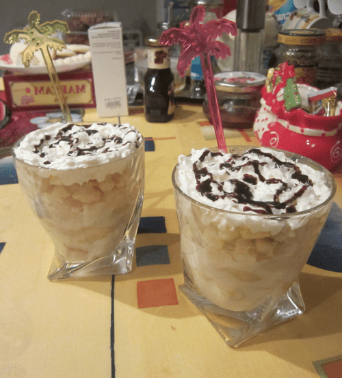 Начать укладывать слои в бокал: 1 слой — бананы, вареные в кокосовом молоке; 2 слой — печенье савоярди; 3 слой — манго или личи; 4 слой — печенье савоярди, сверху пропитываем сиропом из консервированных фруктов (примерно 2 столовые ложки); 5 слой — взбитые сливки, политые шоколадным соусом.