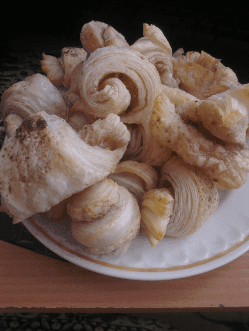 На каждый кусочек насыпать сахара, корицы (я в некоторые добавляла маленькие кусочки горького шоколада и грецких орехов).