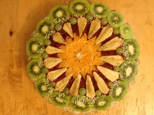 Если хотите разукрасить торт в красный цвет, нужно размельчить сухие листья гибискуса (только немного, а то он жутко кислый) в порошок и добавь в банановый мусс, этой штукой можно сверху намазать торт, сверху украшаем фруктами и кунжутом, если торт высокий то по бокам можно приляпать кружочки бананов. Если нет мёда, можно заменить финиками.