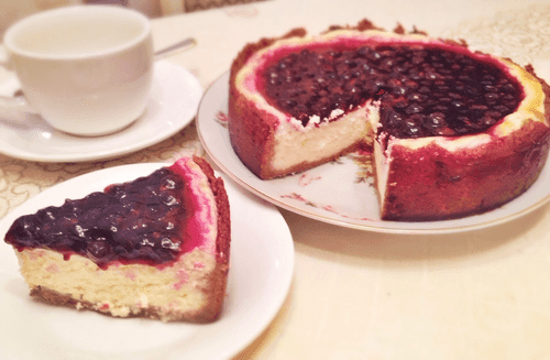 Для топпинга я использовала замороженную смородину, которую поварила 5 минут (т.н. пятиминутка) с сахаром и корицей. Предварительно замочила желатин, когда он набух, чуть подогрела в микроволновке, вылила в кастрюльку со смородиной и мешала до растворения. Вылила ягоды с сиропом на готовый пирог и убрала в холодильник.