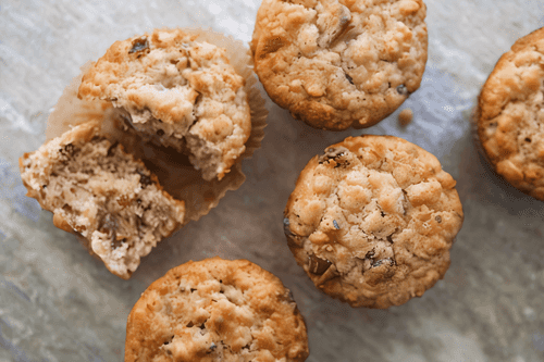В большой миске смешайте с помощью венчика муку, овсянку, разрыхритель, соль, корицу, мускатный орех и сахар. В отдельной посуде смешайте с помощью миксера масло, яйцо и яблочное пюре. Вмешайте яично-яблочную смесь в мучную. Хорошо перемешайте. Добавьте изюм и орехи. Ещё раз хорошо перемешайте.