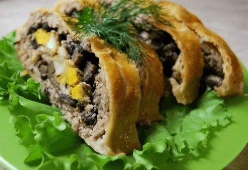 Мясной рулет с грибами и сыром в слоеном тесте