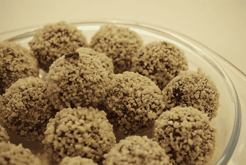 Шарик обваливаем в молотом кешью, ставим в морозильную камеру на час.