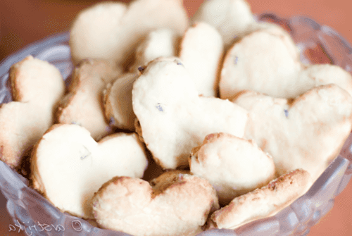 Взбить сахар, желток и яйцо в пенную массу. Добавить половину масла, муку, разрыхрытель, лаванду и ванильный сахар. Вымесить тесто и оставить его в холодильнике на три часа.