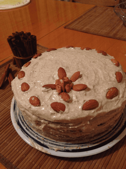 Выложите тесто в форму и выпекайте при 180 градусах 50-60 минут. Если морковь была очень сочная или диаметр вашей формы менее 26 см, то время выпекания увеличится до 70-80 минут ориентировочно. Корж должен получиться пышным и красивого насыщенного терракото-коричневого цвета.