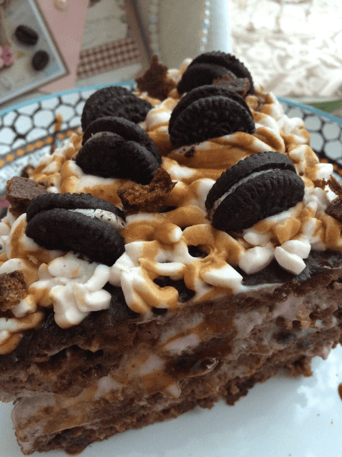 После того, как корж будет готов разрезать его на 4 части. Сделать прослойки приготовленного йогурта. Сверху нанести крем с помощью кондитерского мешка.