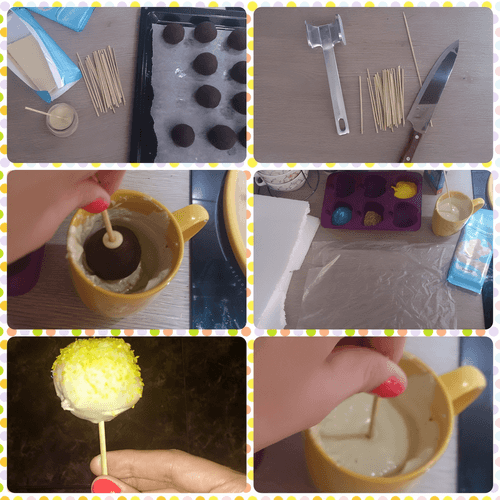 Вынуть из холодильника шарики. Палочку окунуть в шоколад примерно на 2-2,5 см и воткнуть в шарик из бисквита. Поставить шарики в холодильник еще минут на 20.