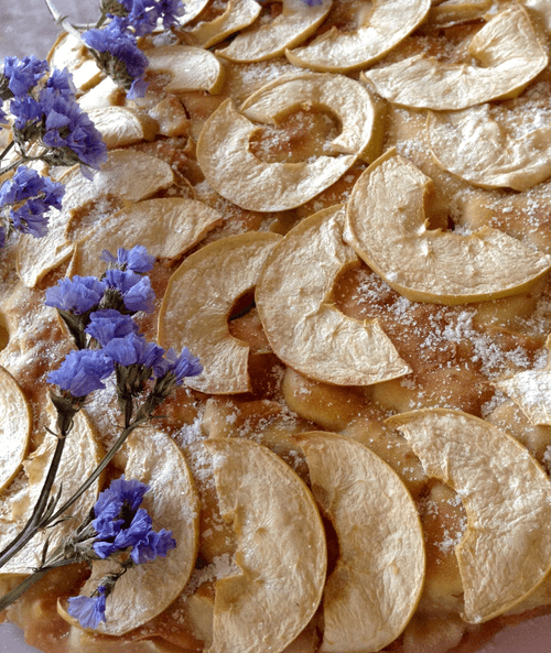 Для запекания потребуется 50-60 минут. В середине приготовления выньте полуготовый пирог, украсьте ломтиками яблока, верните в духовку.