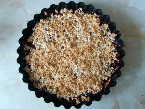 Для теста смешать сливочное масло, сахар, муку и ванилин. Перетереть в крошку и посыпать фруктово-ягодную смесь.