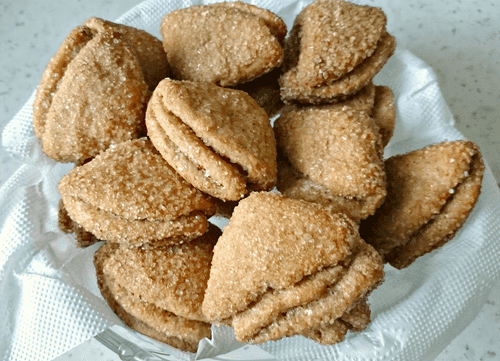 Возьмите большую тарелку и высыпьте в неё сахар. Каждый кружок теста обмакните в сахаре с одной стороны, затем сложите его вдвое сахарной стороной внутрь, далее снова обмакните одну из сторон в сахаре и вновь сложите вдвое сахаром вовнутрь. Таким образом получился конвертик. Одну сторону также обваляйте к сахаре, а другую оставьте нетронутой.