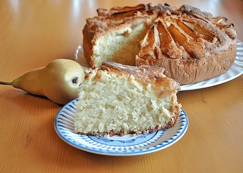 Вылить половину теста вылить в форму.И уложить первый слой груш. Вылить вторую часть теста и выложить верхний слой груш. Поместить в духовку примерно на 1 час с температурой 180 градусов.