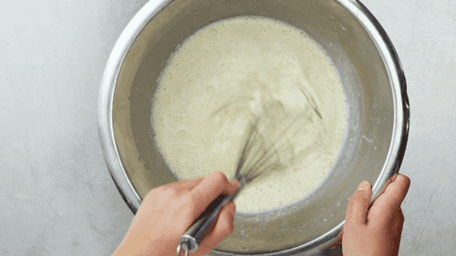 Тем временем, венчиком смешать яичные желтки (предварительно отделив их от белков), 135 г сахара, 70 г муки и щепотку соли. Медленно влить молочную смесь, как следует вымешивая, чтобы не было комков. При желании это можно сделать в блендере.