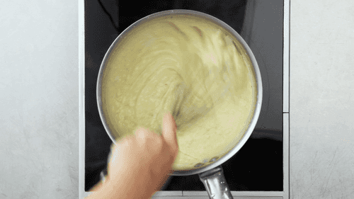 Перелить смесь в сотейник. На медленном огне нагреть соус, постоянно мешая, пока масса не загустеет и на поверхности не образуются пузыри. Это займет около минуты. Вмешать желатин и тут же убрать с огня, чтобы масса не подгорела. Перелить в чашу и накрыть пленкой так, чтобы она плотно прилегала к соусу. Убрать в холодильник на 3 часа. Если комки в соусе все таки образовались, то его стоит протереть через сито после того, как он остынет.