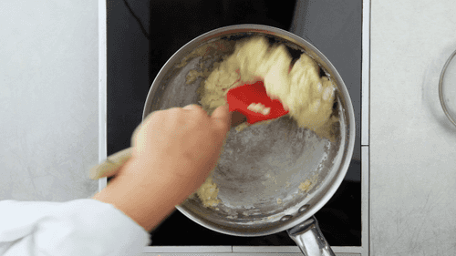 Для теста, в небольшом сотейнике разогреть 1 стакан воды и растопить 90 г масла, нарезанного мелким кубиком. Убавить огонь до минимума, добавить 140 г муки и ¼ ч л соли. Мешать и варить тесто до тех пор, пока оно не начнет легко отставать от сотейника, около 1 минуты. Переложить в большую чашу. С помощью миксера, ввести 4 яйца по одному за раз, хорошо перемешивая. Накрыть пленкой, дать остыть в течение 1 часа.