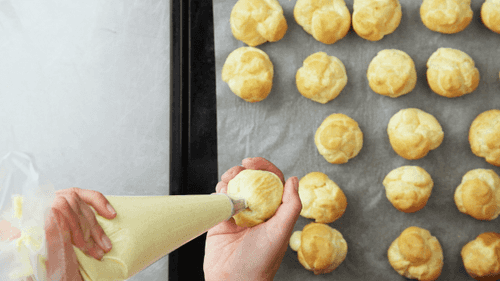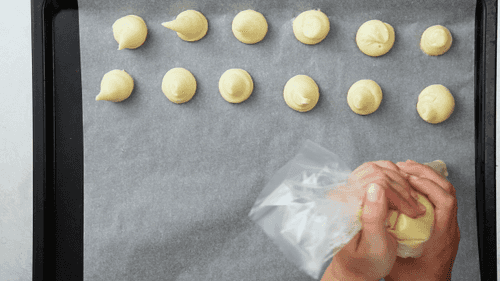 Разогреть духовку до 220 С. Накрыть противень пергаментной бумагой. Переложить тесто в кондитерский мешок с круглой насадкой. Выдавить небольшие шарики на подготовленный противень, оставляя между ними около 1 см. Верхушку примять влажными кончиками пальцев. Выпекать до золотистого цвета, около 23 минут. Достать из духовки, проткнуть каждый шарик кончиком ножа, дать остыть.