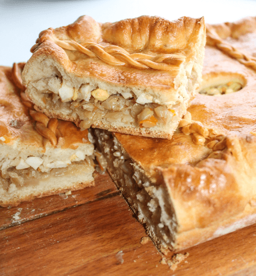 Пирог с капустой, луком-пореем и яйцом — душистый, нежный и сытный представитель русской кухни. Этот рецепт уходит корнями в традиционные крестьянские пироги, где использовались простые, но питательные ингредиенты. Воздушное дрожжевое тесто, мягкая капустная начинка, ароматный лук-порей и нежность вареного яйца создают гармонию вкусов. Он идеально подходит как для семейного обеда, так и для уютных вечеров с чаем. Благодаря сочетанию овощей и яиц пирог получается сбалансированным и питательным, а легкая сладость теста подчеркивает его вкус. Подается теплым, чтобы тесто осталось мягким, а начинка раскрыла свою насыщенность. Такое блюдо не только утоляет голод, но и переносит в атмосферу домашнего уюта, где ценится забота и тепло.