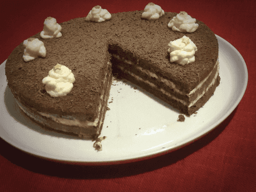 Торт: каждый слой бисквита вначале равномерно пропитывается, после чего на него выкладываются взбитые сливки. Количество слоёв бисквита 2-3. Толщина прослойки из взбитых сливок не больше толщины бисквита. Верхний слой бисквита после пропитки смазывается смородиновым джемом. Шпателем убрать излишки сливок выступающих по краям торта. Посыпать верх торта тёртым шоколадом.