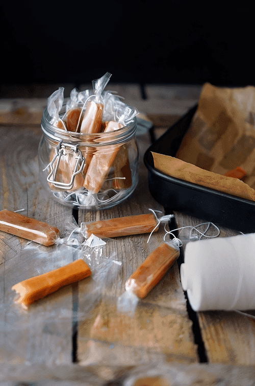 Где-то через 3 часа карамель стоит поставить в холодильник. Она окончательно схватится. После этого просто мокрым ножом разрезаем карамель на конфетки. Если она сильно застыла — нож нагрейте в кипятке, но не сильно. Конфетки можно посыпать пудрой, миндальной мукой или солью — сейчас это модно и, что говорить, вкусно. Я на первый раз делал базовый вариант.