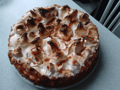Достаём наш тортик из духовки и аккуратно, выкладываем на него пышный белок. Можно сделать рисунок или горочки. Если есть кондитерский мешок, делайте свои шедевры :))) Ставим обратно в духовку 3-5 минут, чтоб слегка под румянился белочек. Белок, может немножко осесть, но ни чего страшного в этом нет. Наш тортик почти готов.
