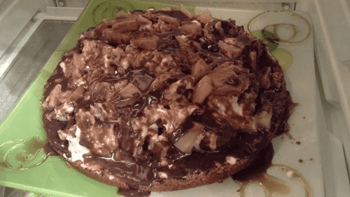 Выложить последний ярус кусочков бисквита, окунутых в крем. Обмазать торт оставшимся кремом со всех сторон с помощью ложки. Примерно так.
