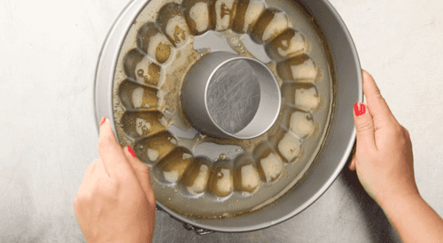 60 г сахара насыпать в сотейник, добавить немного воды и растопить до образования карамели красивого янтарного цвета. Аккуратно, стараясь не обжечься, перелить карамель в форму для флана. Оставить до тех пор, пока карамель не схватится.