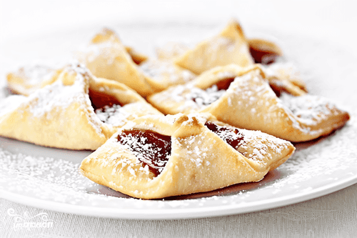 Руками замешивать тесто до тех пор, пока оно не перестанет липнуть к рукам, сформировать из него шар. Раскатать тесто на слегка присыпанной мукой поверхности в пласт толщиной 3 мм. Вырезать из теста квадратики размером примерно 6х6 см. В центр каждого квадратика положить по чайной ложке варенья или джема. Аккуратненько защипать два противоположных уголка квадратика, формируя что-то наподобие бабочки. То же самое проделать с оставшимися квадратиками теста.