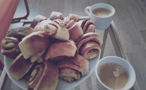 Тесто разделить на 2 части. Каждую часть раскатать в прямоугольник, намазать половиной начинки, скатать в рулет и разрезать примерно на 8 частей. Получившиеся булочки выложить на смазанный маслом или застеленный пергаментом противень, по желанию для придания корочки смазать яичным желтком и выпекать около 15-20 минут.