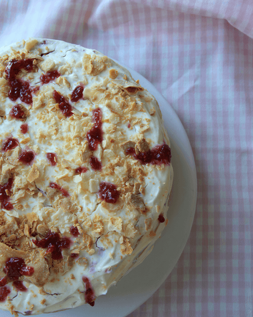 В сборке торт прост — смазать малиновым сиропом корж, затем распределить крем и так до тех пор, пока коржи не закончатся