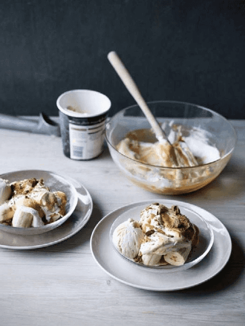 Разложить бананы и шарики мороженого по тарелкам, украсить сверху ложкой смеси из сливок и вареной сгущенки.
