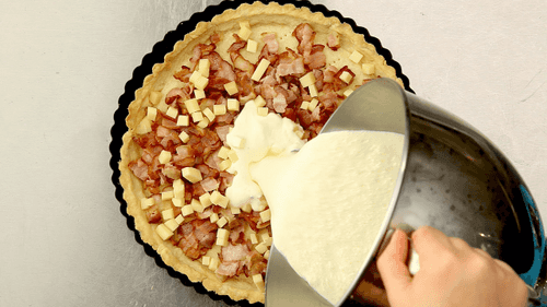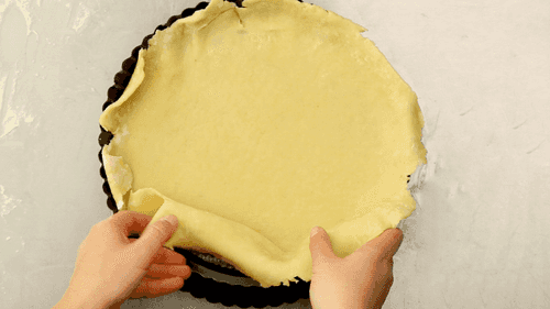 Вымесить тесто на подпыленной мукой поверхности и сформировать шарик. Завернуть в пленку и дать остыть в течение 10-15 минут. Раскатать тесто и выложить в форму для киша. Обрезать лишнее тесто по краям, оставляя немного запаса — тесто при выпечке сядет и важно, чтобы оно не стало меньше самой формы.