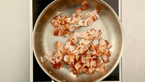 Пока выпекается тесто, нарезать бекон на тонкие полоски и обжарить на раскаленной сковороде до тех пор, пока кусочки не подрумянятся. Не стоит зажаривать их до хрустящего состояния. Переложить бекон на бумажные салфетки и дать лишнему жиру впитаться. Четверть сыра натереть на мелкой терке, а остальное нарезать мелким кубиком.