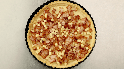 Выложить обжаренный бекон и сыр кубиком на дно формы с тестом.