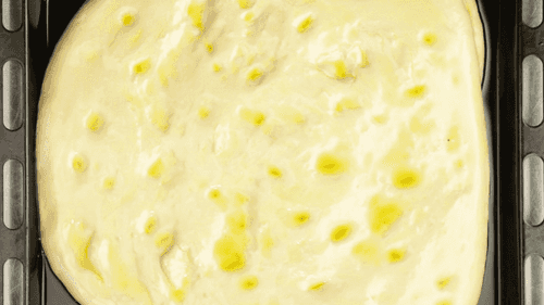 Переложить тесто в форму. Ладонями разровнять тесто, слегка надавливая, чтобы вышел воздух. Сверху слегка сбрызнуть тесто оливковым маслом и слегка надавить кончиками пальцев на тесто, чтобы на поверхности появились ямочки ( не стоит давить до образования дырок). Накрыть полотенцем и оставить в теплом месте еще на 20-40 минут, до тех пор, пока тесто не увеличится вдвое.