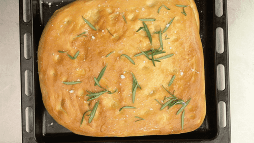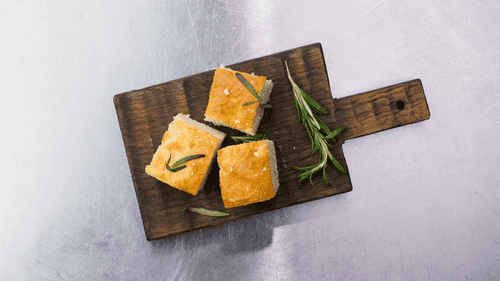 Пред подачей, посыпать хлеб крупицами морской соли и веточками розмарина. Подавать с оливковым маслом и бальзамическим уксусом.