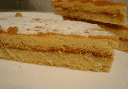 Выпеченный корж горячим смазываем тонким слоем густого повидла (у меня яблочное), разрезаем пласт на две половины и аккуратно складываем одну часть на другую так, чтобы на верхнем пласте повидло было сверху. Когда остынет, посыпаем сахарной пудрой).