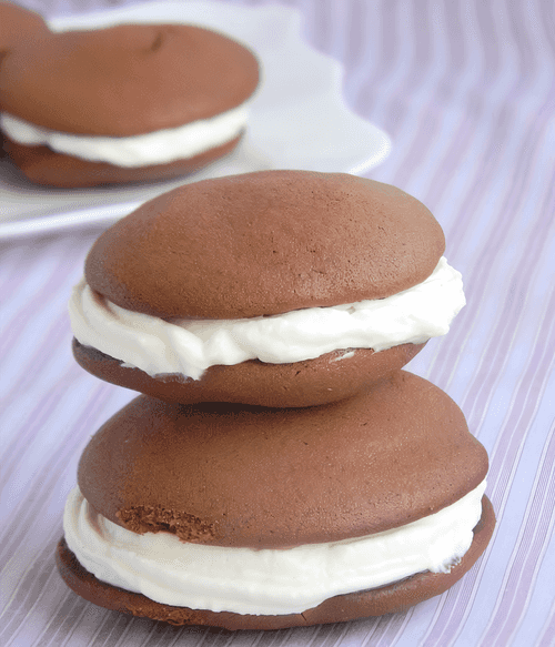 Взбить сливки с сахарной пудрой до устойчивых пиков. Выложить крем на одну лепешку, накрыть другой и пирожное «Вупи Пай» готово.