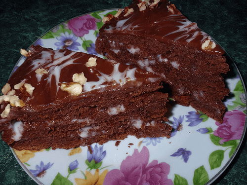 Верх порываем глазурью: 1 ст. ложка какао, 1 ст. ложка сметаны, 1 ст. ложка сахара, 1 ст. ложка сливочного масла — все разогреть, хорошо растереть до однородной консистенции и быстро залить торт.