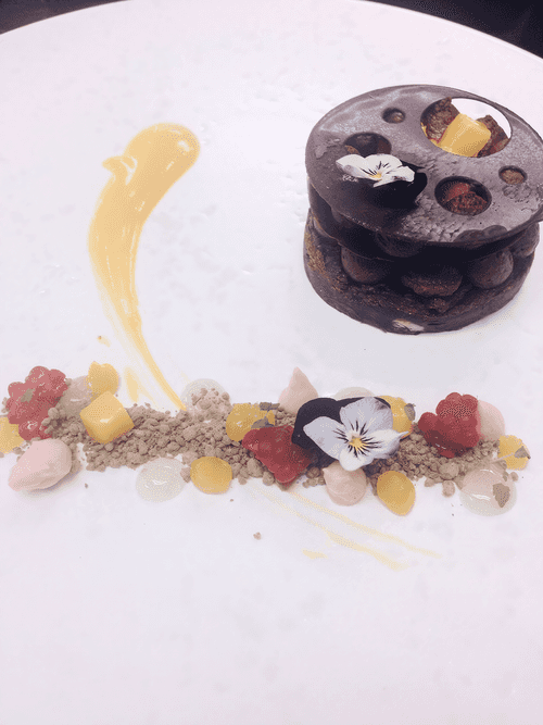Для десерта как на фото из остывших брауни нужно вырезать круг. Мусс переложить в кондитерский мешок и отсадить небольшие капли по периметру. В центр сложить нарезанное маленькими кубиками манго. Сверху положить тонкий диск шоколада, снова отсадить мусс по периметру, сложить внутрь манго и закрыть диском шоколада.