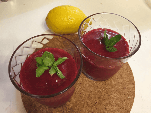Добавьте сахар, сок лимона, листья мяты (оставьте несколько листьев для украшения). Измельчите при помощи блендера до получения густой однородной массы.