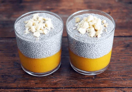 Заполнить стаканчики с соусом из манго смесью из молока и чиа и оставить в холодильнике на ночь, или хотя бы на 4 часа.