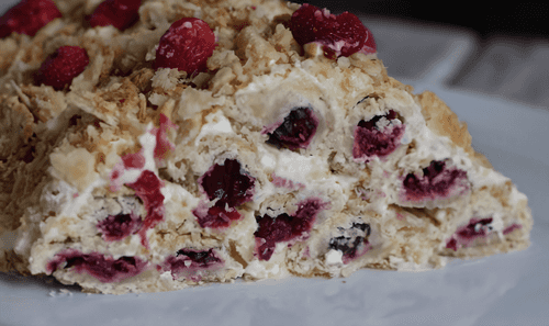 Измельчите запеченные в духовке полоски без начинки. Сверху посыпьте торт этими крошками. Так же десерт можно украсить ягодами клубники. Отправьте торт на ночь в холодильник.