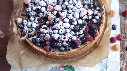 Охлажденный десерт аккуратно извлечь из формы, украсить свежими ягодами и/или фруктами. Перед непосредственной подачей посыпать чизкейк сахарной пудрой.