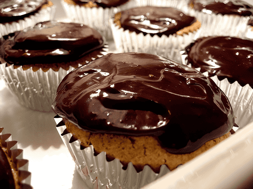 1. В большой миске смешайте муку, какао, сахар и разрыхлитель. 2. Шоколад поломайте на кусочки и добавьте к сухим ингредиентам. 3. Миксером взбейте яйца, размягченное масло и молоко. 4. Смешайте сухие и жидкие смеси, хорошенько перемешайте. Для этих кексов не страшно, если будут небольшие комочки. 5. Разлейте смесь по формочкам для маффинов и выпекайте в разогретой до 180°С духовке около 20-25 минут. Проверьте на готовность зубочисткой. 6. Шоколад порубите и залейте горячими сливками. Дайте минуту постоять, а потому перемешайте до однородной шелковой консистенции. 7. Готовые кексы покройте ганашем и подавайте.