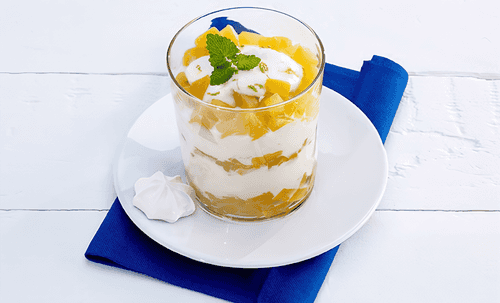 Получившийся кокосовый мусс и абрикосы положить слоями в посуду для десерта. Безе раскрошить и посыпать сверху. Украсить готовый десерт листочками мелиссы.