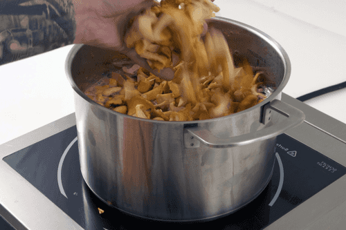 Всыпать нарезанные грибы, грибы, довести до кипения 2-3 раза.