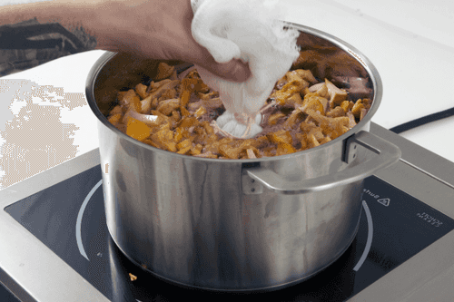 Перевести огонь на средний, добавить морскую соль и помещенные в мешочек гвоздику, можжевельник и розмарин.