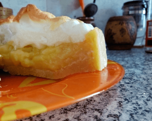 Взбить белки до пены, добавить примерно 60 гр сахара, взбить до средних пиков (поскольку мы готовим мягкую меренгу). Аккуратно выложить белки поверх крема. Выпекать пирог при температуре 175 градусов около 10 минут, пока меренга не станет приятно-золотистой.