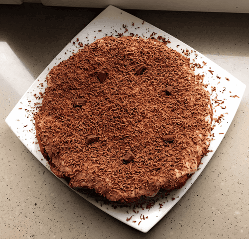 . Сверху украшаем его ранее отложенным в мисочку кремом и тертым шоколадом.