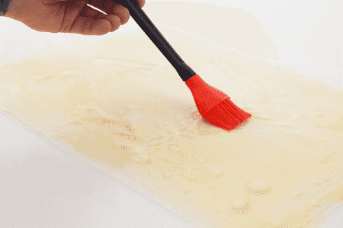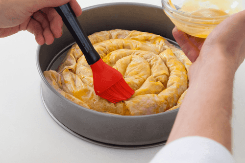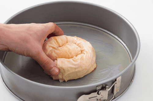 Выстелить лист фило на столе и смазать его растопленным сливочным маслом. Сверху положить еще один лист теста и смазать его маслом тоже.