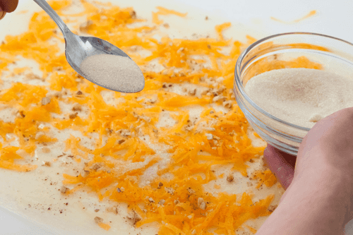 Насыпать часть тертой тыквы на тесто, сверху немного орехов, корицы и сахара.